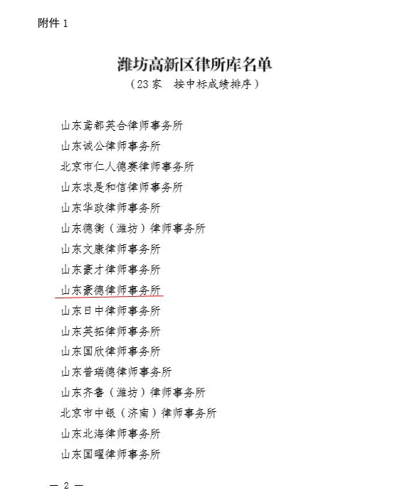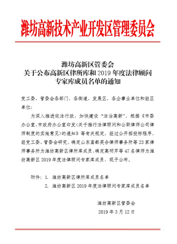 我所通过公开招投标的方式,成功入选为潍坊高新区律所库成员,同时我所付兴刚主任、王存东副主任入选为潍坊高新区2019年度法律顾问专家库成员。