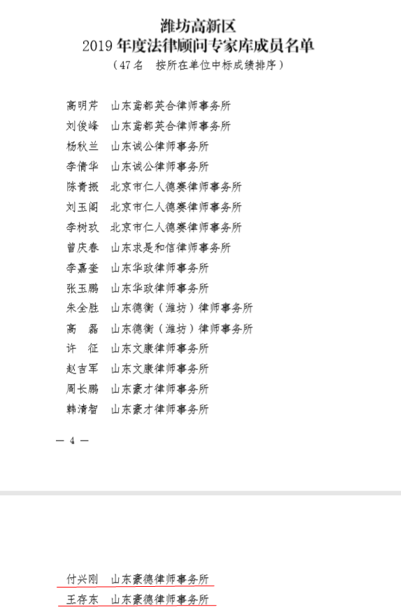 祝贺豪德律所入选潍坊高新区律所库成员,付兴刚主任、王存东副主任入选潍坊高新区 2019 年度法律顾问专家库成员