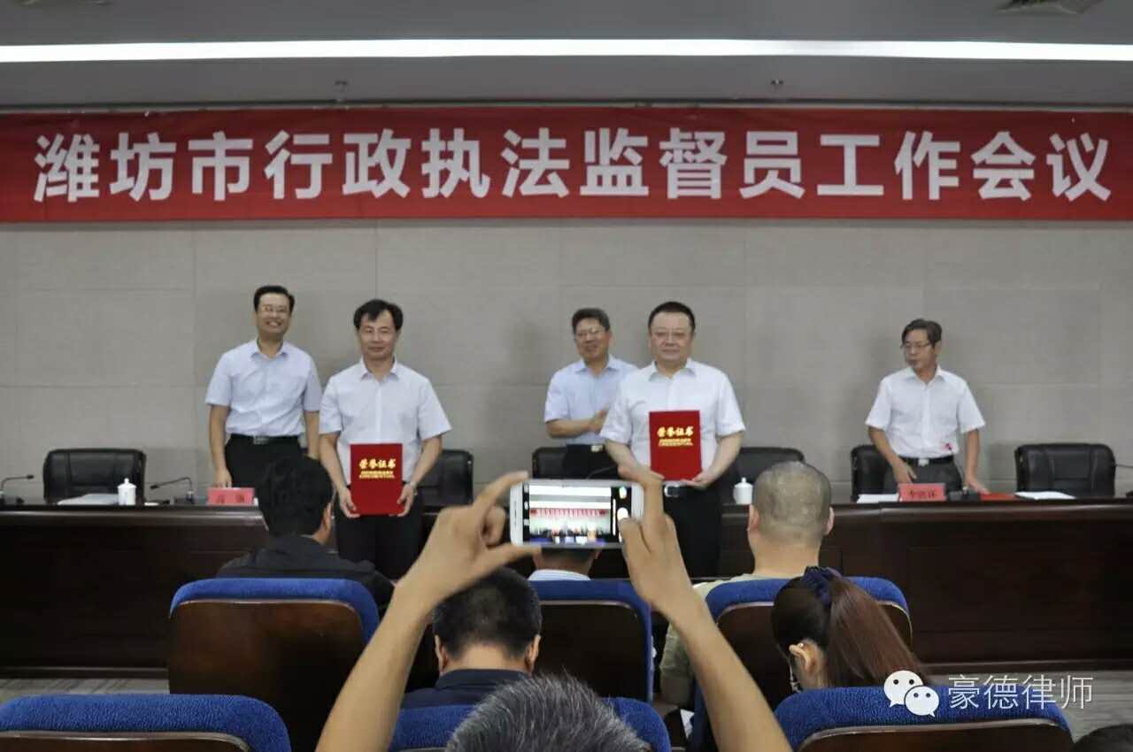 8月3日上午,第四届潍坊市行政执法监督员工作会议在市政务服务中心四楼会议室召开。市政府法制办党组书记、主任高成勇,市政府法制办党组成员、副主任李清环,市政府法制办党组成员、市行政复议裁决办公室副主任高强出席此次会议。我所付兴刚主任作为潍坊市行政执法监督员受邀参加。会议表彰了第四届市优秀行政执法监督员和组长,公布了我市行政执法监督工作联系点,并现场进行颁奖和授牌。