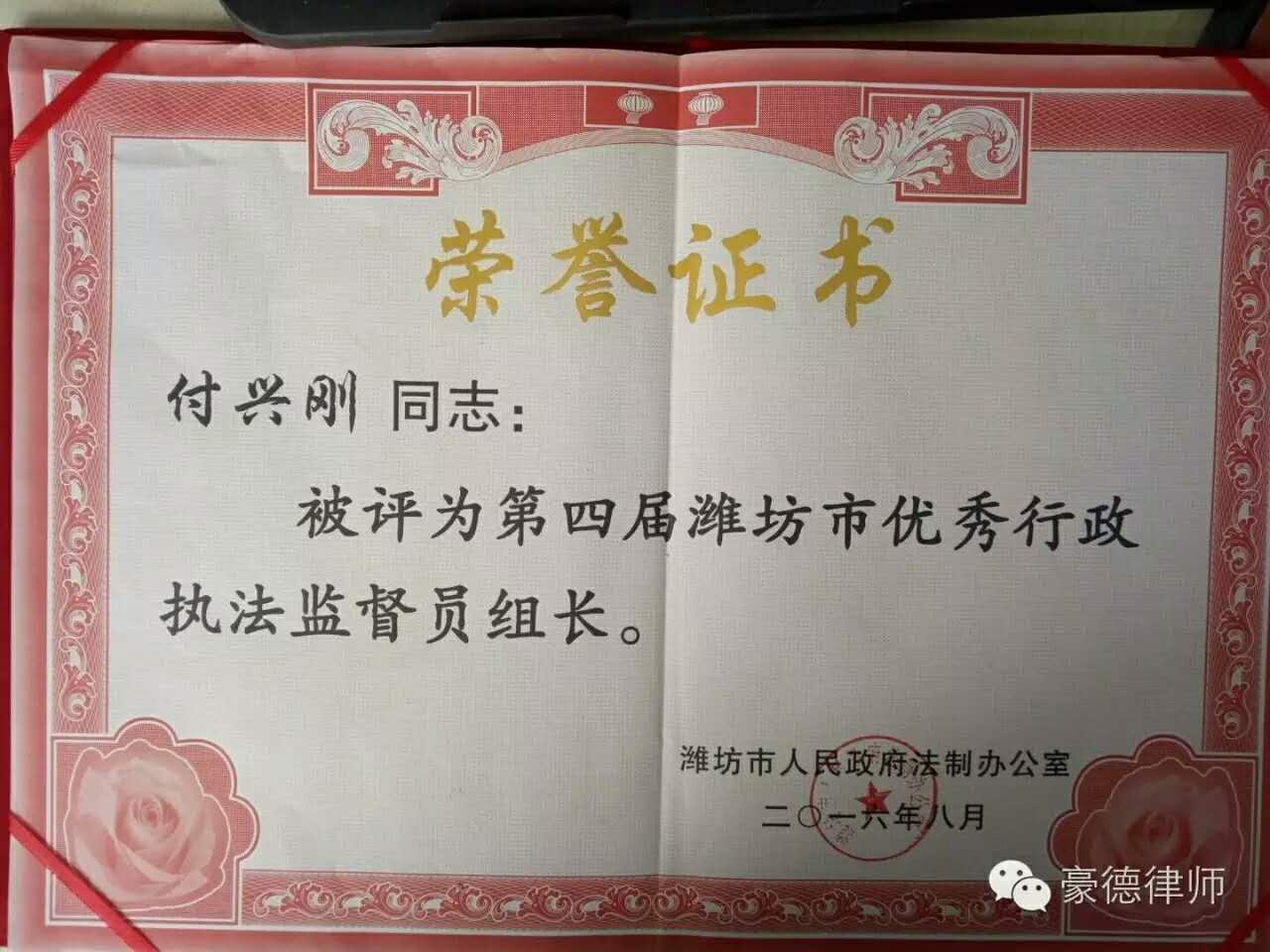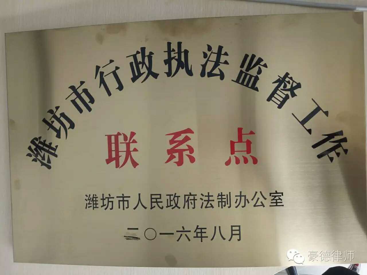 热烈庆祝我所被推选为潍坊市行政执法监督工作联系点,付兴刚主任被评选为第四届潍坊市优秀行政执法监督员组长