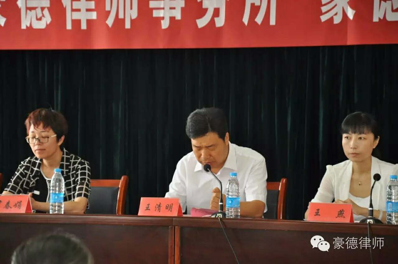 2016年6月24日上午,山东豪德律师事务所在潍坊学院行政楼隆重举行第六届“豪德律师奖学金”颁发仪式。潍坊学院副校长王清明致辞,致公党潍坊市委会秘书长王燕、办公室主任尹春娟,致公党高新(寒亭、坊子)支部主委马伟红及潍坊学院部分致公党员教师应邀出席仪式,潍坊学院统战部部长徐树芝,潍坊学院法学院院长苗金春、党总支书记徐隆彬,致公党员、山东豪德律师事务所主任付兴刚、豪德律所党支部书记冯伟明以及法学院师代表出席颁发仪式。