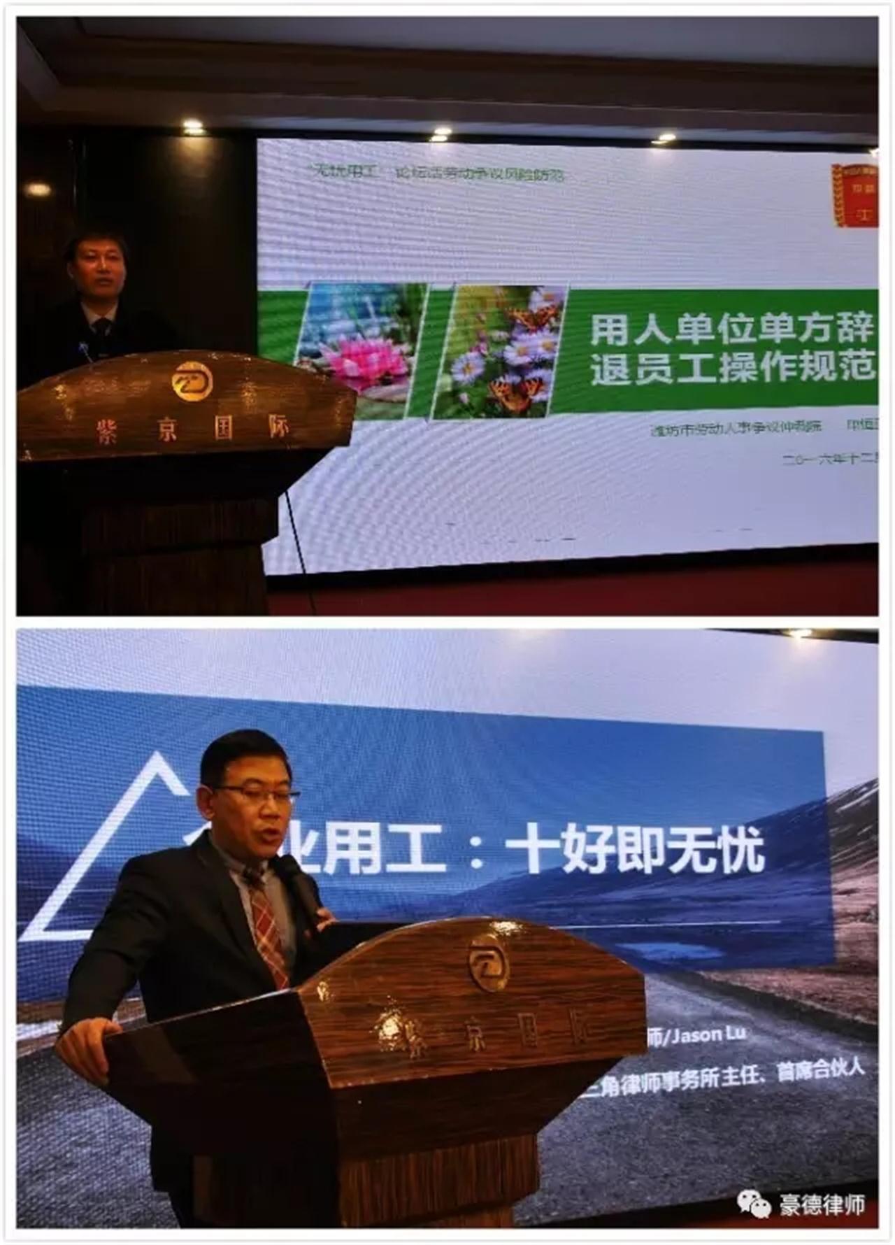 潍坊市委政法委副书记、市法学会会长秦景岗同志、潍坊市法学会副会长兼秘书长葛金军同志、山东大学法学院副院长张海燕教授、山东大学法学院秦伟教授、潍坊劳动人事争议仲裁院副院长康恒武院长、潍坊学院法学院院长苗金春教授、目前国内最大最专业的劳动法律服务机构上海江三角律师事务所陆敬波主任、山东豪德律师事务所付兴刚主任以及山东豪德律师事务所党支部书记冯伟明同志应邀出席了论坛,
